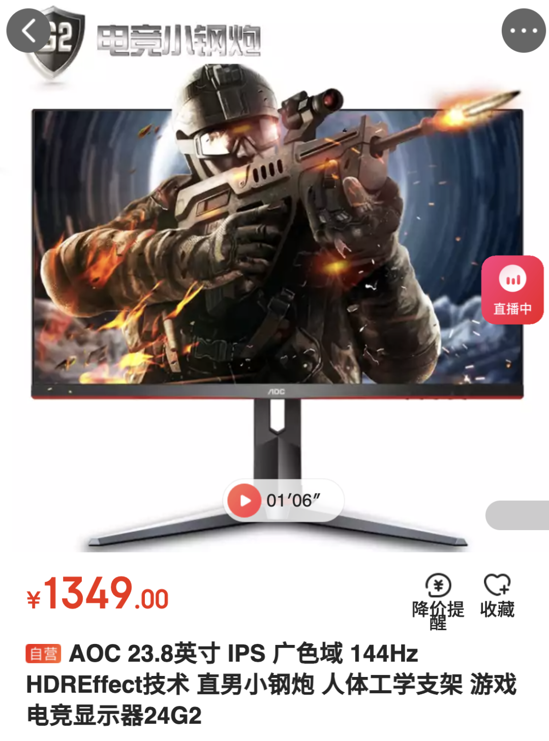 AOC 24G2 售价 1349 元,适合主流游戏玩家入手。