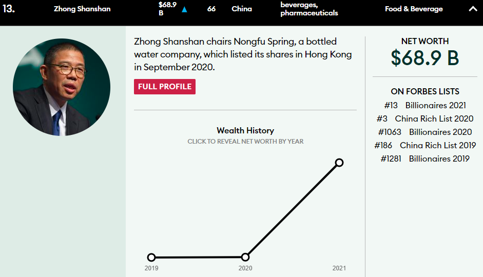排在全球榜单第13位的农夫山泉创始人兼董事长钟睒睒以净资产689亿美元(约合人民币4506亿元)的身家成为榜单上的中国首富。值得注意的是,钟睒睒同时也是全球食品饮料领域富豪的榜首。