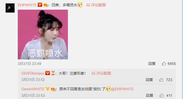 白宇哪能受这气,顺着网线也要夺回面子,在该条动态回复: