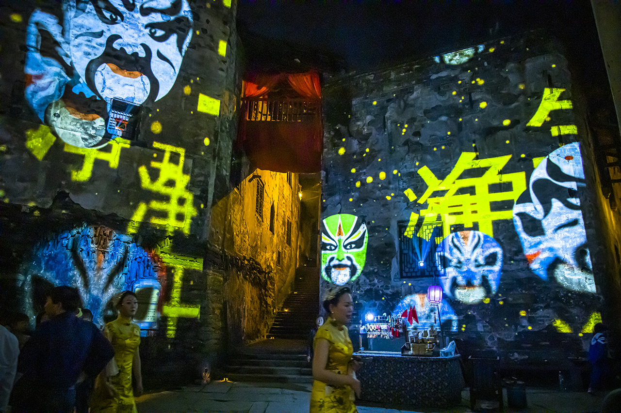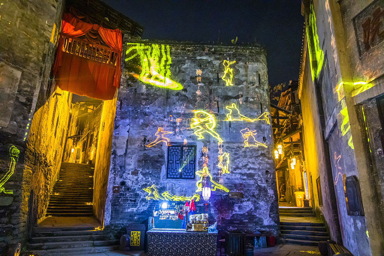 夜晚,神奇的光影秀让洪江古商城活了起来,动态景观灯以“光影流转洪江美,古韵湘西洪商情”为主题,重现了洪江古商城“山为骨架、水为血脉”的构架和“鳞次栉比、帆樯云骤”的繁华盛景。
