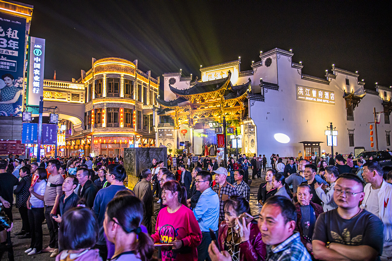 临整个古商城热闹非凡,人潮汹涌,节目精彩纷呈,吸引了无数游客来此观看游玩,各种手机相机拍摄不停,都想保留好这夜的美。特别是在清明假期期间:每晚八点,洪江古商城还有以“光影流转洪江美 古韵湘西洪商情”为主题的夜景灯光秀,游客可在古商城内尽情感受古建筑与艺术灯光结合之美,尽享洪江特色。