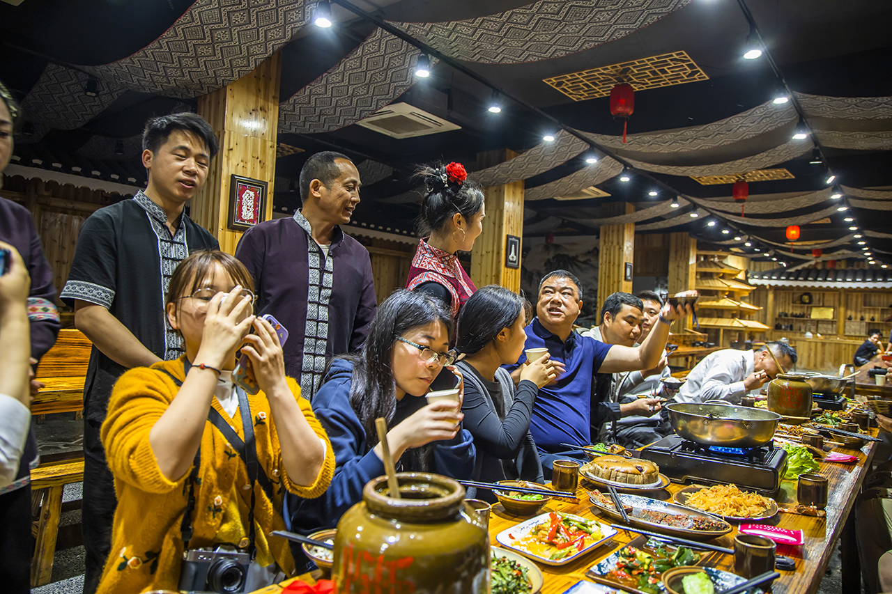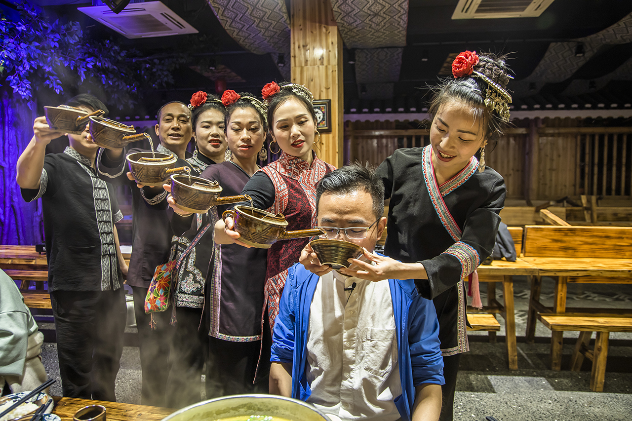 随着 夜幕降临,热情好客的侗家人会盛情邀请你围坐在长长的木桌上品尝合拢宴。在品尝侗族美味佳肴的同时,一定要感受一下当地特色的敬酒礼节,高山流水。