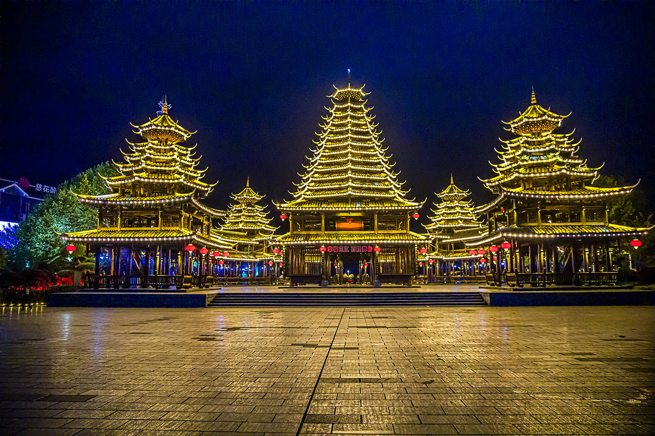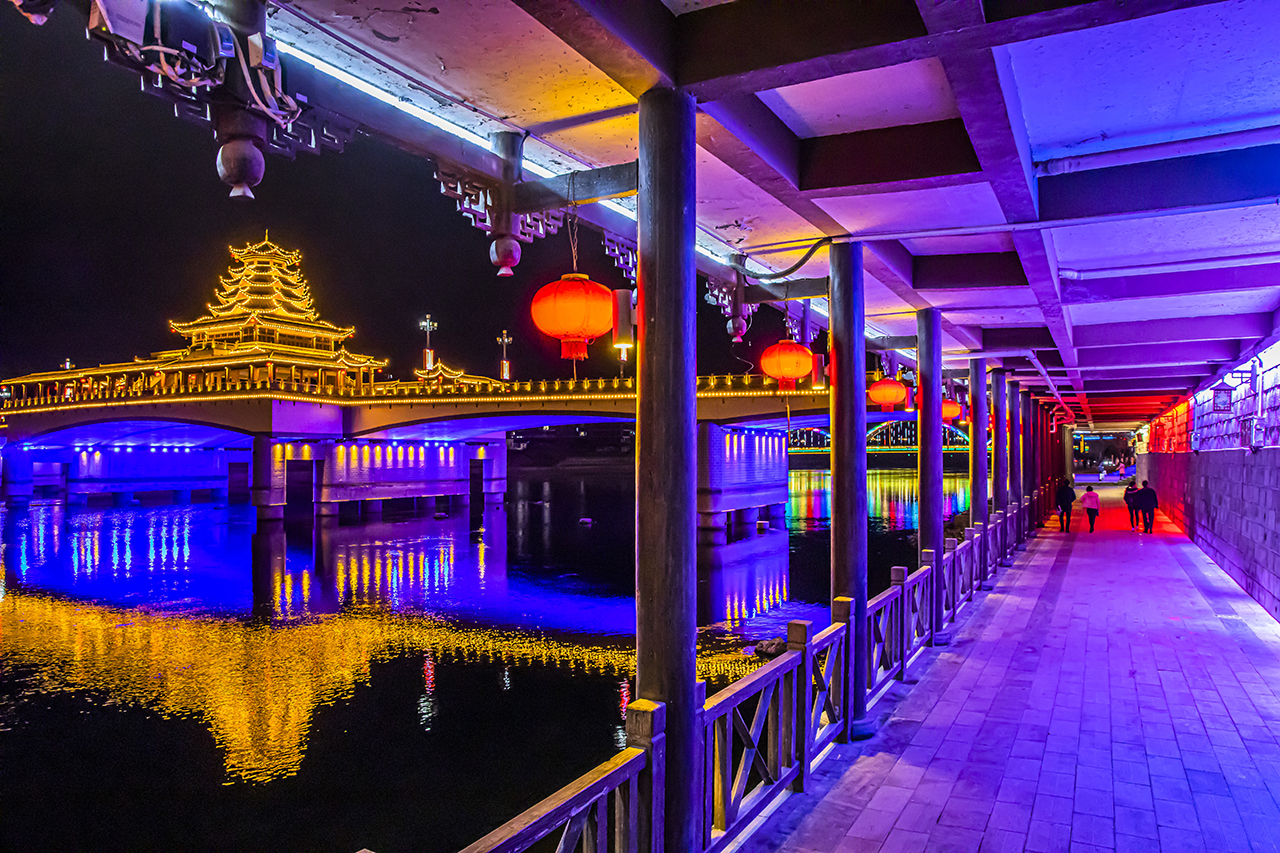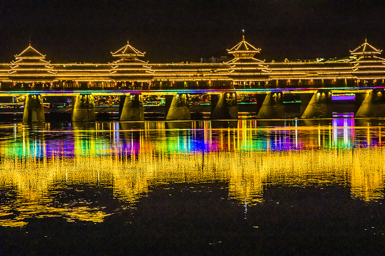 华灯初上时,芷江之夜灯火通明,绚丽缤纷,芷江在霓虹灯掩映下像披上一身光彩夺目的黄金霓裳,在夜色和灯光交织映衬下无不闪耀着金色光辉。站在美轮美奂的芷江县城河堤上,侗族鼓楼群、沿河两岸的风雨桥、从文阁、吊脚楼等建筑上的彩灯如群星闪耀,灯光映照在河水上相互辉映,色彩斑斓让人沉醉。