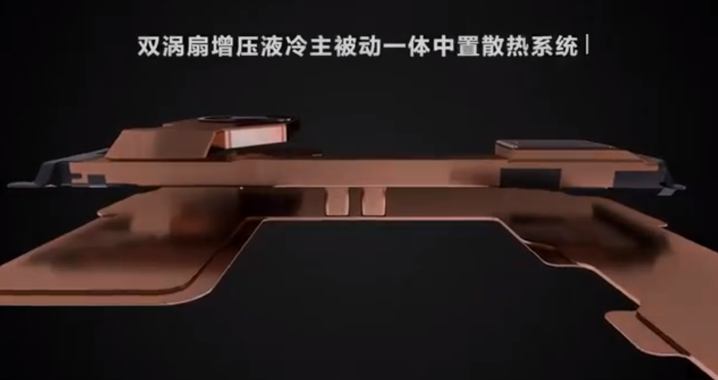 采用了主动风冷、被动液冷、中置架构三合一的方式。官方的名号有点儿长:「全球首个双涡扇增压液冷主被动一体中置散热系统」。大概是真的很长,所以官方给它起了个极简的名字:沨(fēng)