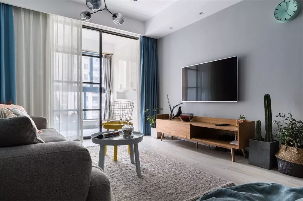 在餐厅另一侧的就是客厅空间,灰色系的电视背景墙上点缀一个迷你挂钟,木质电视柜和绿植搭配起来,更加自然、舒适。