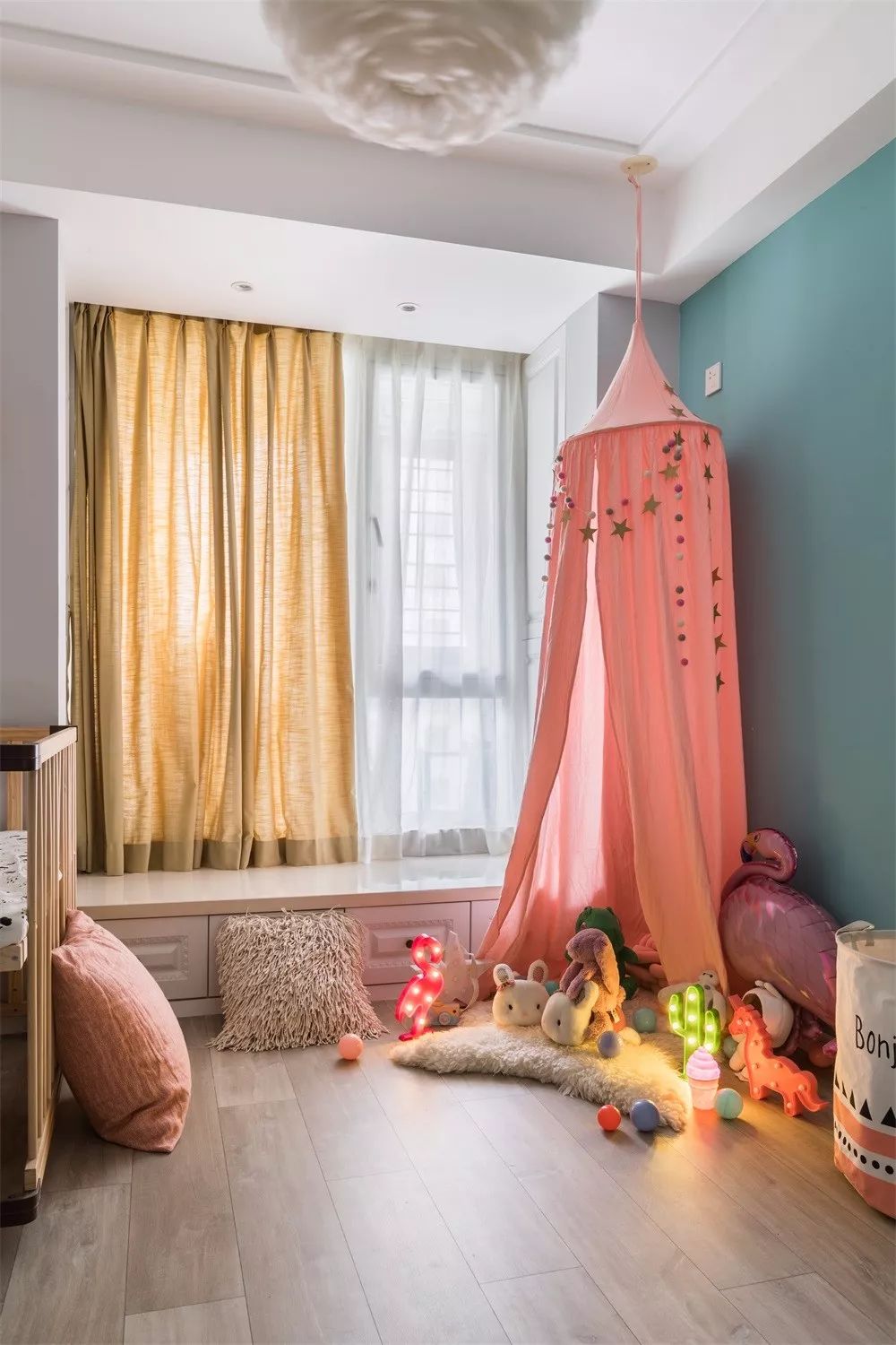 因为孩子还小,所以儿童房内并没有太多的东西,一张婴儿床、一个帐篷,搭配羽毛吊灯、玩具玩偶等等,浪漫而又温馨。