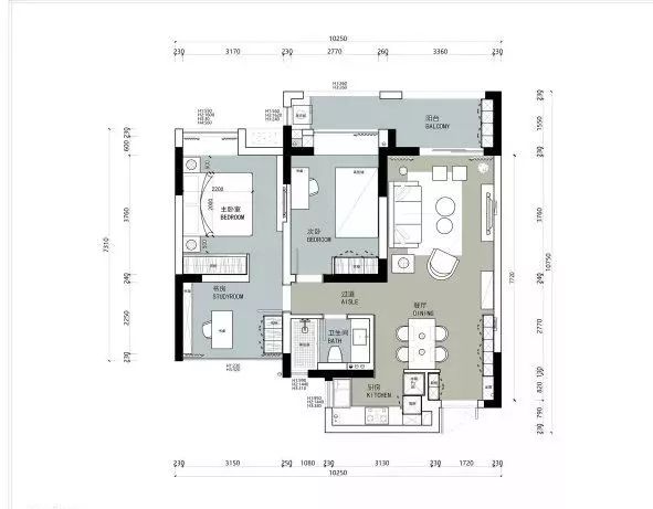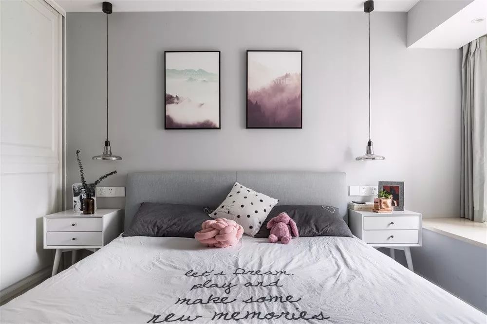 主卧室也是以灰色为主,搭配白色的柜子,左右对称的床头柜和吊灯和挂画结合起来,让卧室看起来更加舒适和美观。