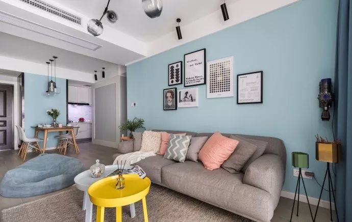 而沙发背景墙是选择了和餐厅背景墙一样的青蓝色,搭配黑框、白框的装饰画,给人一种清新而又简约的文艺感,北欧风的迷你茶几也是亮点。