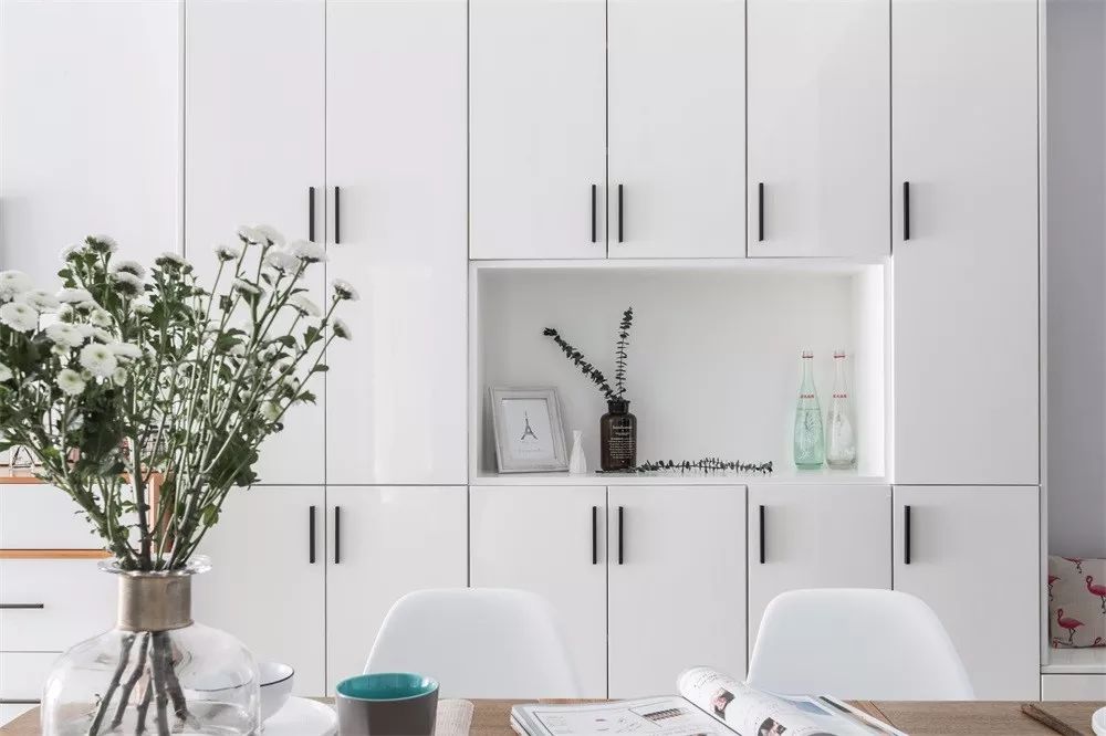 到顶的鞋柜也作为餐边柜来用,中间处留空方便存放一些杂物和装饰品,白色柜子搭配黑色的门把手,给人一种简洁感。