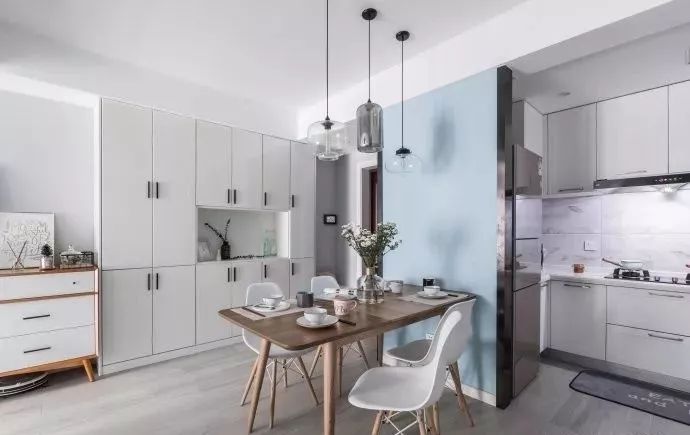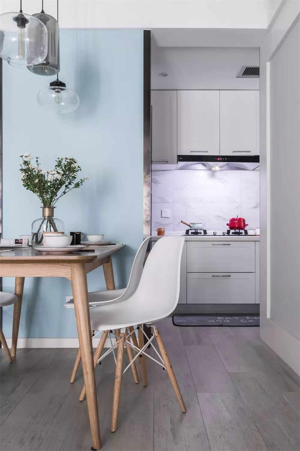 入户处的玄关走廊做了换鞋凳和鞋柜组合式的设计,走过小玄关之后就到了餐厅,蓝色的背景墙搭配原木风的餐桌椅,非常好看。