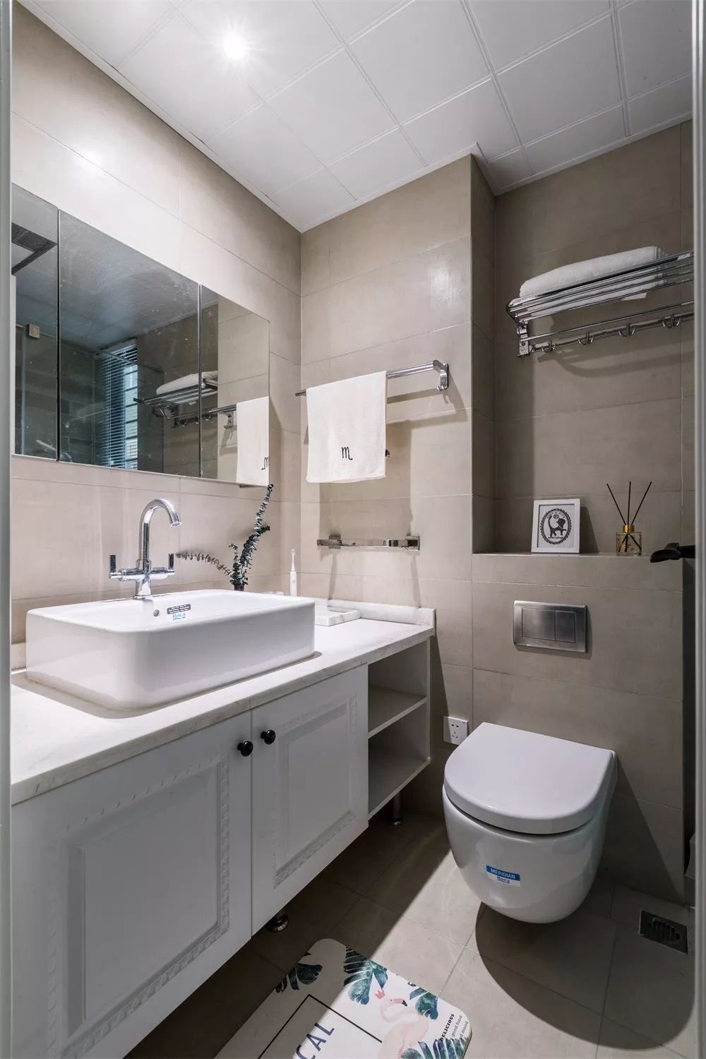 卫生间内部空间比较充足,把洗手台和淋浴房做在了卫生间的两侧,入墙式的马桶位于中间,浴室柜搭配置物架、镜柜的收纳设计,能够满足卫生间的收纳需求。