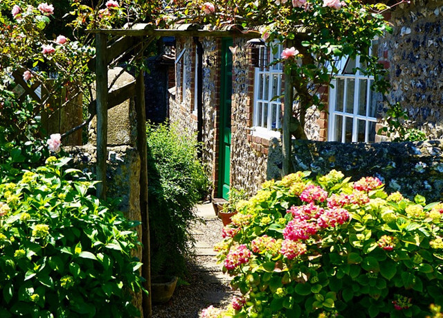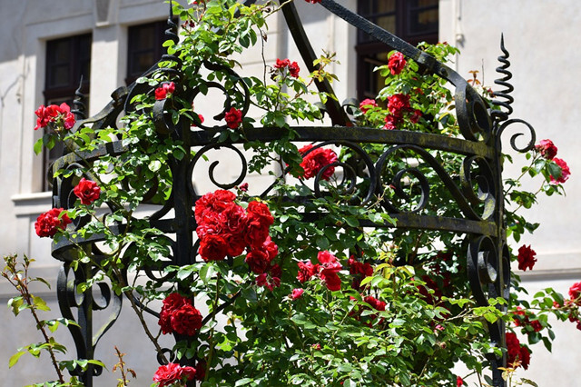 可在房前搭棚设架,种植紫藤、常春藤、爬山虎、木香、葡萄、凌霄、金银花等藤本花木,搭起花屏或花的拱门,盛夏高温时,浓叶满架,休憩其下,顿觉心旷神恰,心境舒畅。