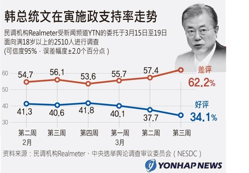3月22日,韩国出炉民调,文在寅政府满意度降至35%,创下历史新低。