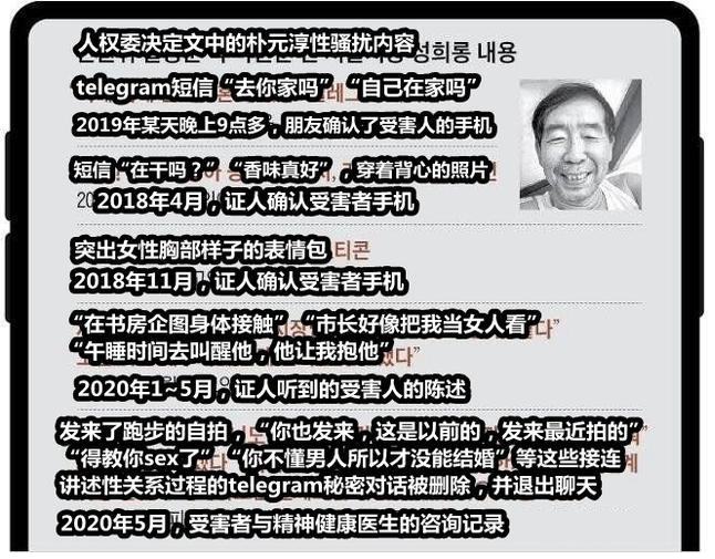 在死前一天,他的前任女秘书向警方荐举朴元淳自2016年起对其持续性骚扰,不仅有肢体接触,还通过Telegram向其发送仅穿着内衣内裤的照片。(Telegram,就是N号房事件中使用的那个有加密自毁功能的通讯软件)