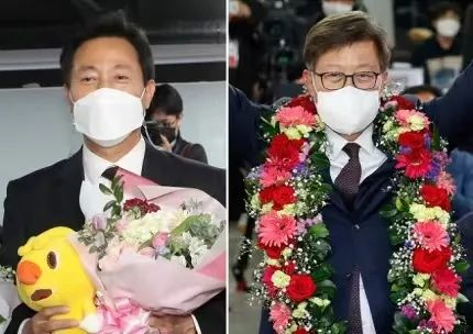 △左图为新当选首尔市长吴世勋,右图为新当选釜山市长朴亨埈