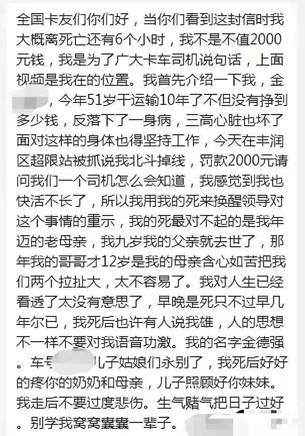 大货车司机金德强为了两千罚款崩溃,不少人说不值得。可你要知道,他死时卡里存款仅6000元,这笔罚款就占了他财产的三分之一。