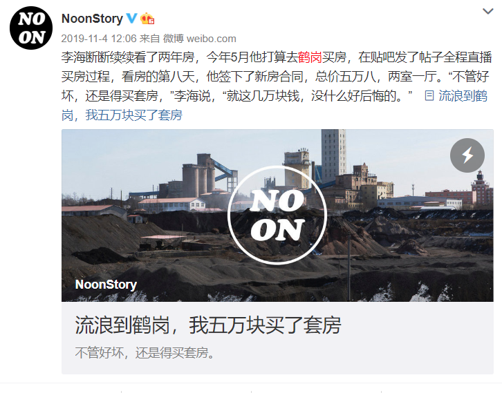 ▲一篇文章带火一座城,网络爆文《流浪到鹤岗,我五万块买了套房》(图/微博截图)