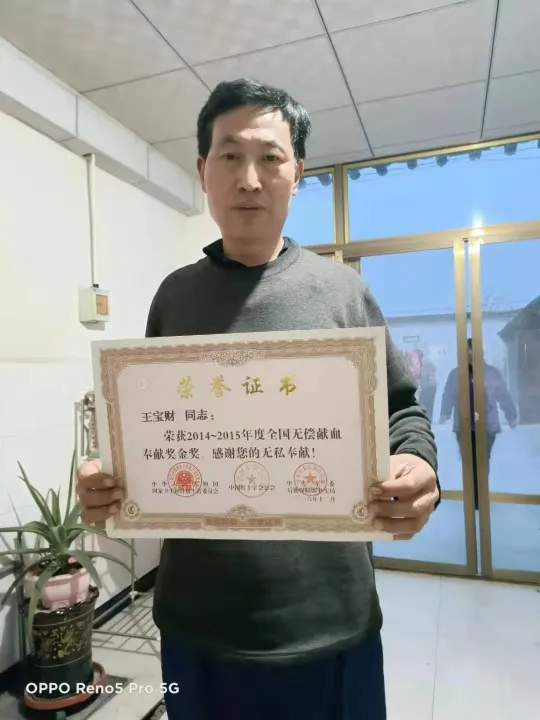 当时,他听医生说,血库库存不足,他就想,得有多少人因为欠血而丢病啊。他决定坚持献血,多救一条命,就是多为社会做一份贡献。妻子和亲人们怕他伤身体,劝他别再献了。王宝财呵呵一笑:献血是光荣的事,不仅不伤身体,还袪病强身呢。他还说了一件有意思的事:有一次,他打了出租车去献血。司机见他有些面熟,问他干什么的。他说是农民,来献血。到站后,司机高低不收他的钱。王宝财把钱硬塞给司机,结果司机把钱扔出窗口,丢下一句:“你们献血者都是我的恩人。我父亲母住院输过血,没有献血者早就不行了。”开起车来,一溜烟跑了。他感觉特别温暖和自豪。