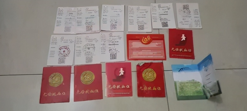 2014年到2015年,是他献血的一个高峰期,他每月都去献,连续坚持了二十四个月。为血库贡献了8800cc的血,唐山血站还为他颁发了全国无偿献血奉献奖金奖奖状。说着,他打开抽屉,只见里面摆放着两大摞红色的小本,还几十张单据,稍稍一数,就有三四十份。据他回忆,三十年来,约献出血液总量为20000cc,相当于四五个成年人的总血量。自豪的同时,他不无愧疚地说:“只有这点能耐回报社会了,能救多少人是多少吧。