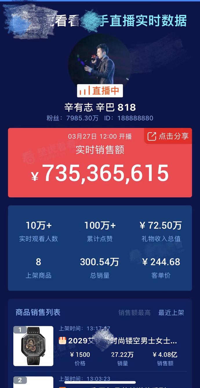 辛巴作为某手平台的头号网红,粉丝8300多万,直播开始1个半小时,销售额就已经7个多亿。这样的成绩确实骄人。
