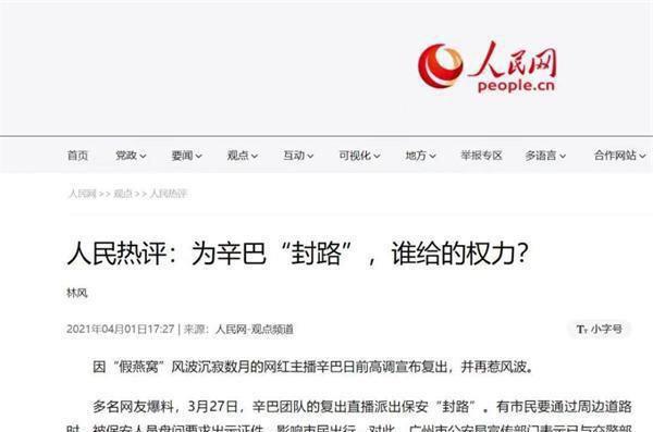 央媒人民网也发文通批:为辛巴“封路”,谁给的权力?