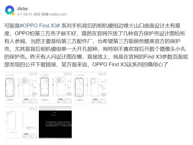 于是,OPPO官方决定亲自现身说法,据微博爆料称,OPPO官方担心第三方外壳设计水平有限,而且官方也希望第三方能做出媲美官方保护壳的设计出来,因此OPPO直接在官网开放了几种官方保护壳设计图给第三方设计厂商作为参考,毕竟后背的相机模组边缘火山口设计真的太有难度,如果一不小心设计风格走偏,那可能也会影响到OPPO Find X3的高颜值,从这层面来说,OPPO Find X3系列确实是用心了。