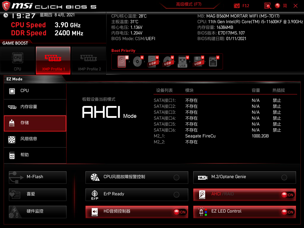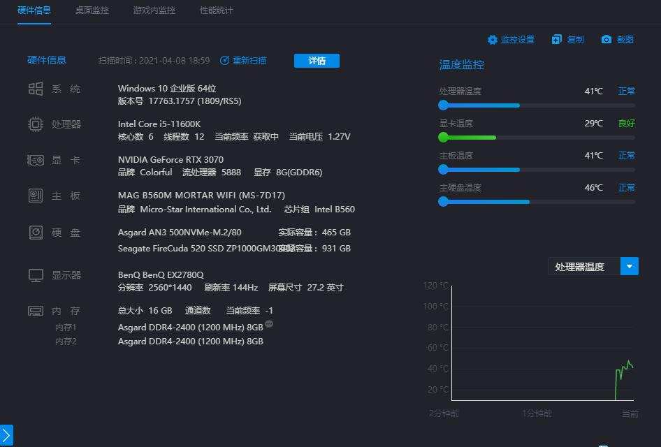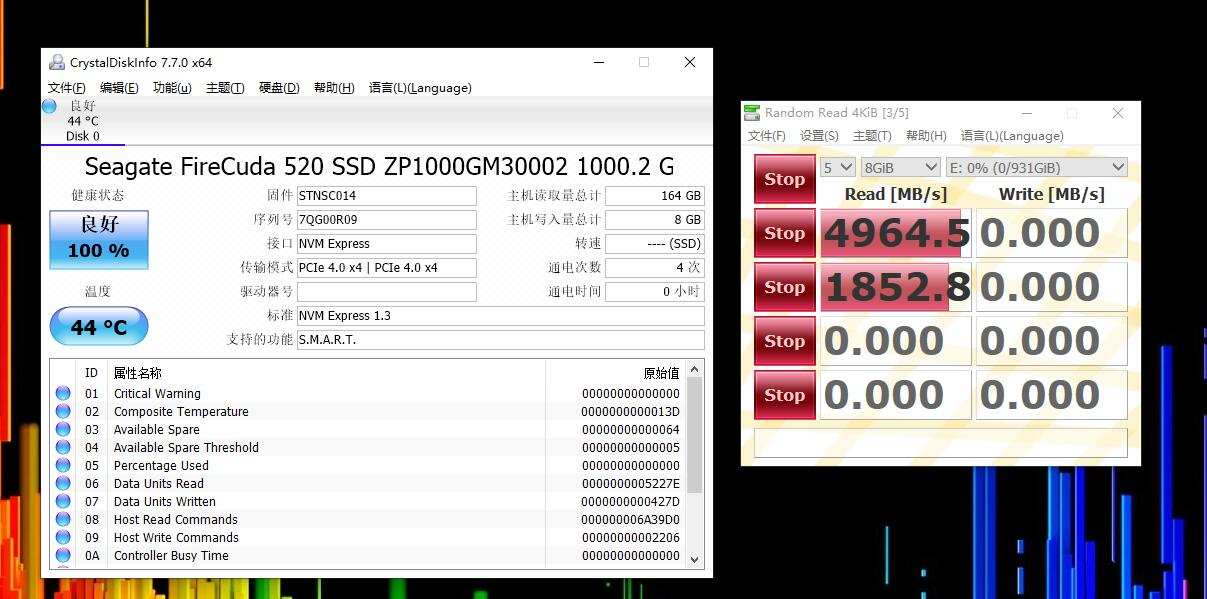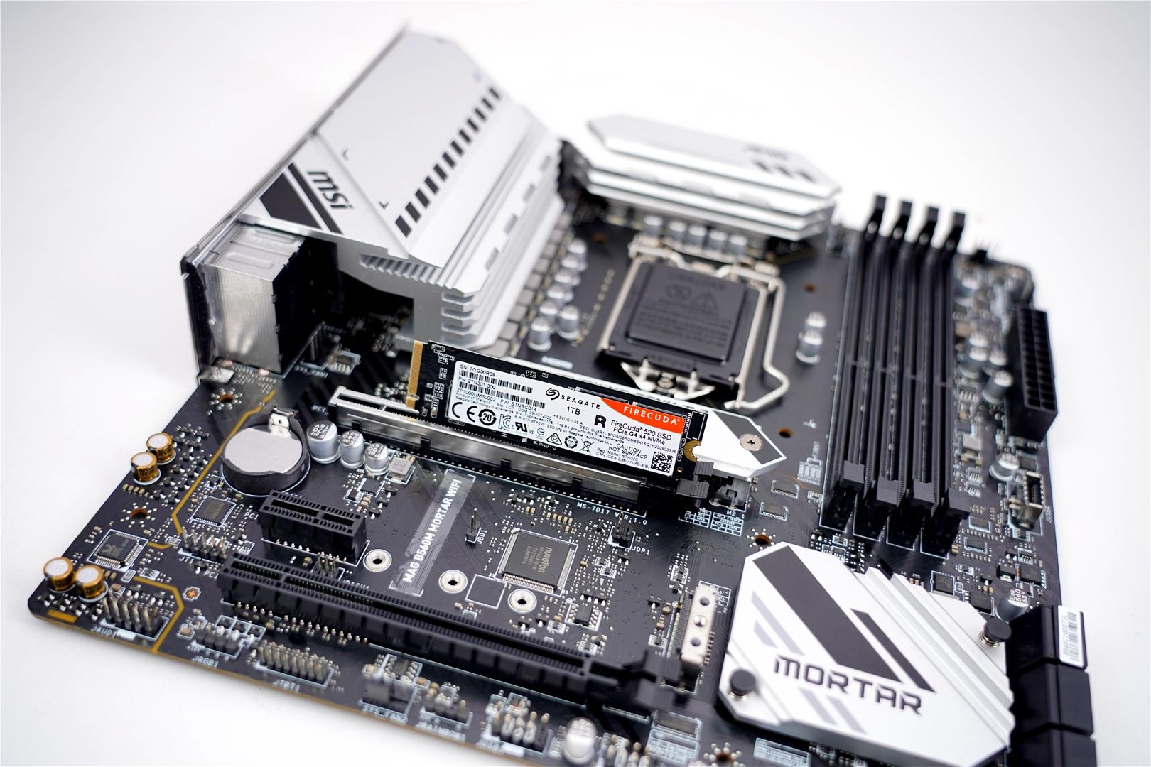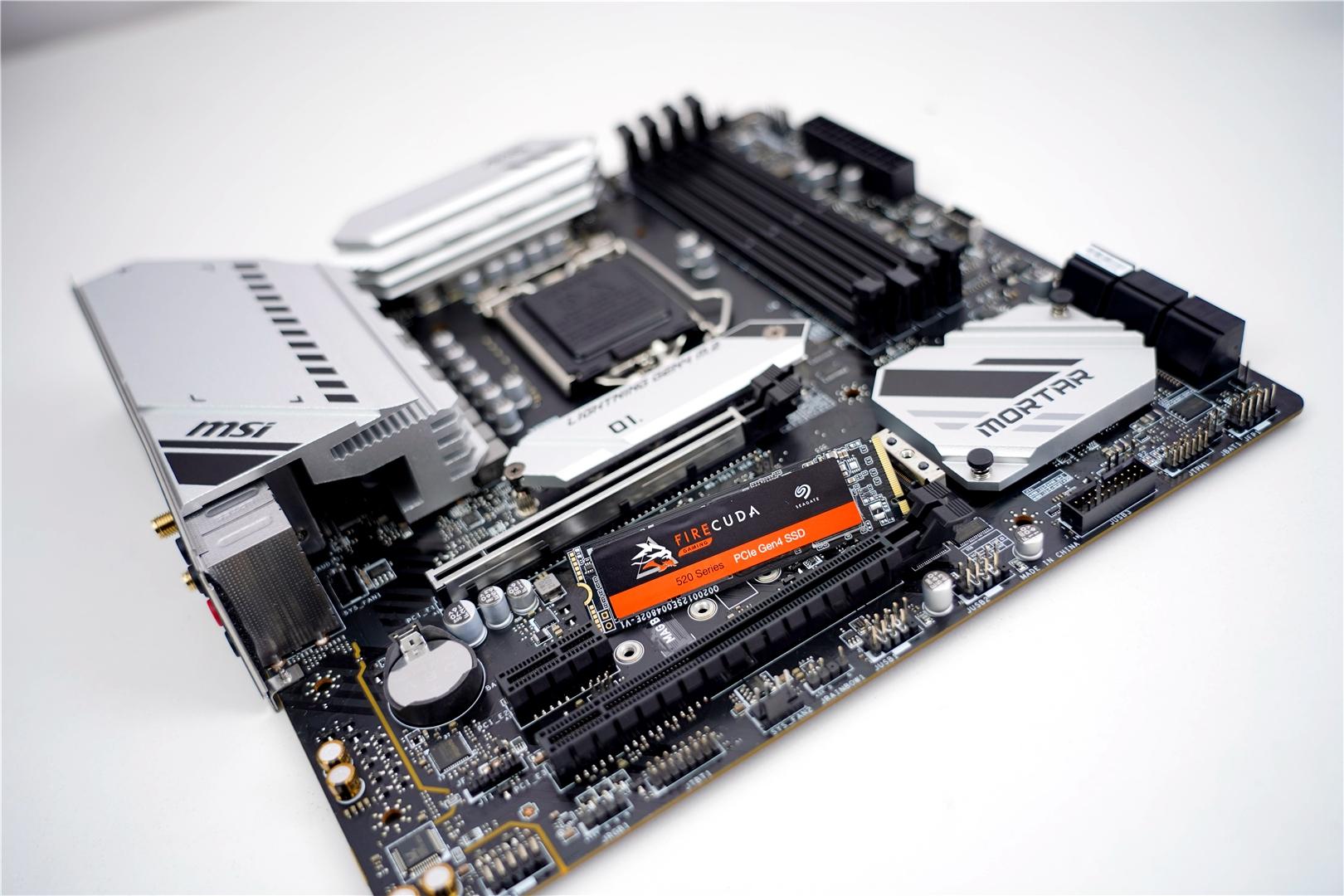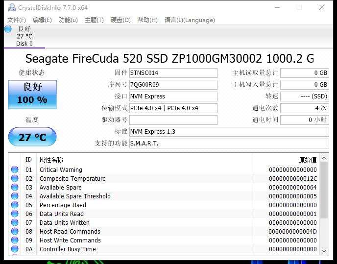 要知道这款微星B560M MORTAR WIFI主板M.2 都可以全速的,最大程度保证了用户的使用体验。好了,先看下希捷酷玩520的身份信息,1T的容量,支持PCIe4.0*4 ,固件STNSC014,待机温度27°,凉爽得很哦,看来散热装机起到效果了。