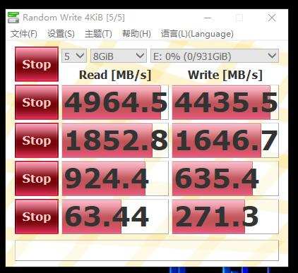 CrystalDiskMark,在测试中,持续读写速度分别达到了4964MB/s和4435MB/s。