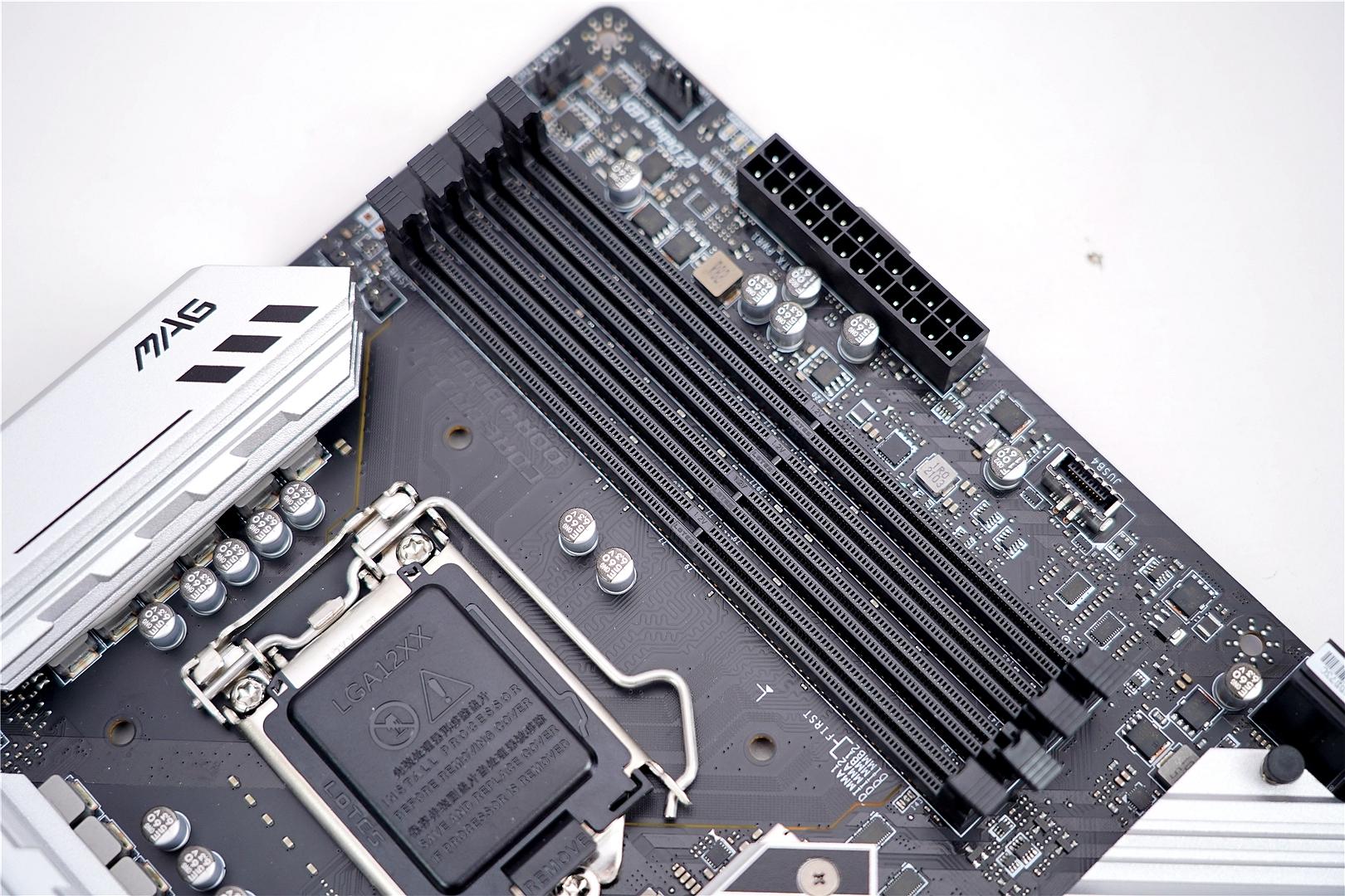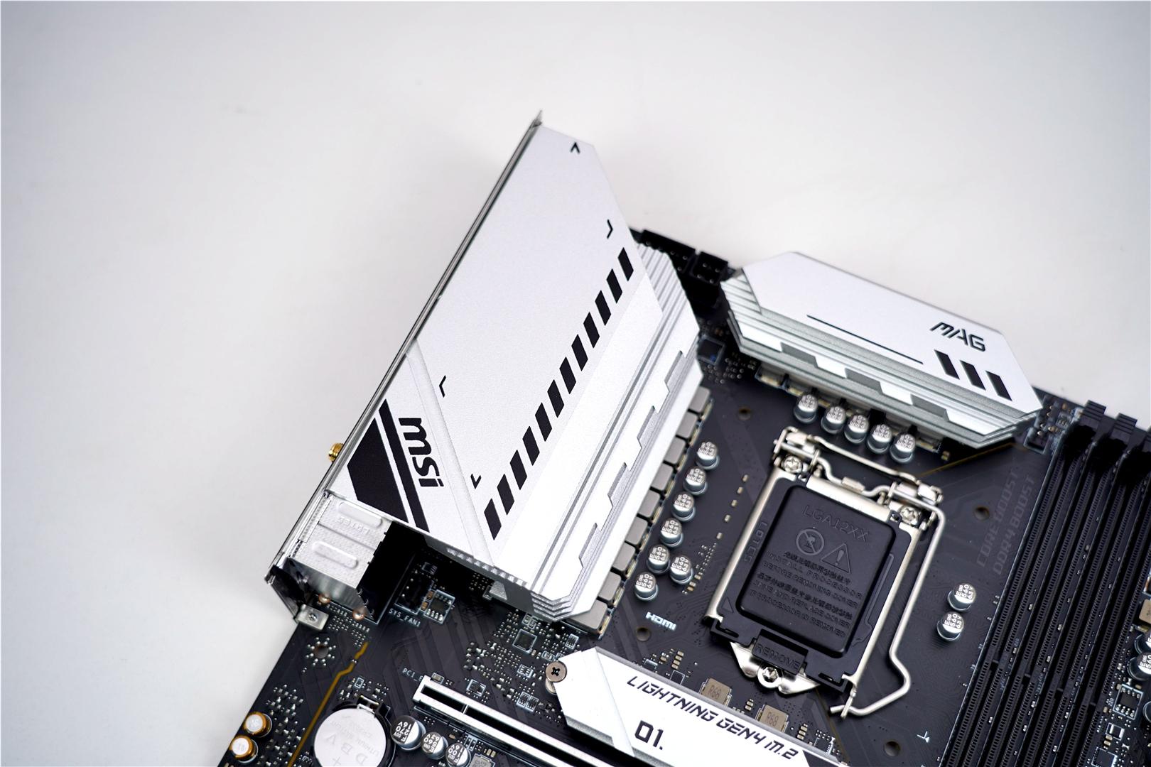 在外观方面,B系列主板的布局一般不会有太大的改动,毕竟空间就那么大。微星B560M MORTAR WIFI的颜值还是很不错的,如果全是白色我觉得更漂亮,当然有可能售价会提高,嘻嘻。因为定位的原因,微星这款B560M并没有太多的装甲覆盖,不过主板的供电部分和M.2硬盘槽还是保留了一贯的设计。我觉得主板稍微再提升一点售价,把另一个M.2插槽加上散热片,这样主板的一体性会更好。