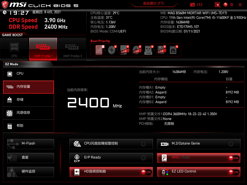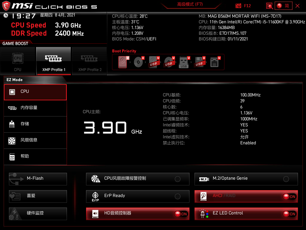 本次测试微星B560M MORTAR WIFI 搭载的是11代酷睿11600kf,可以充分发挥SSD和内存超频的实力。
