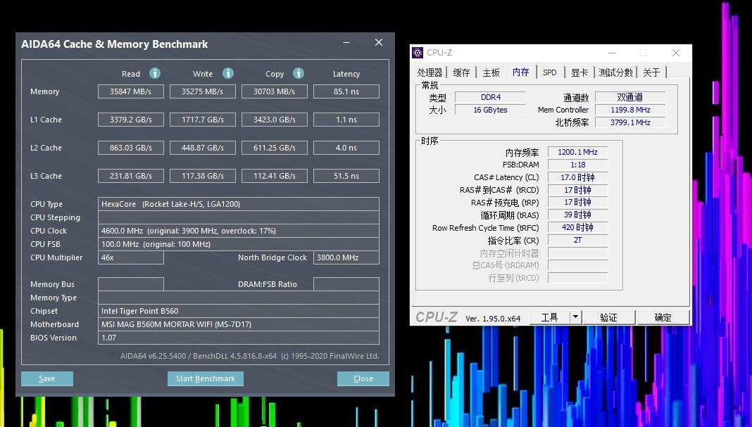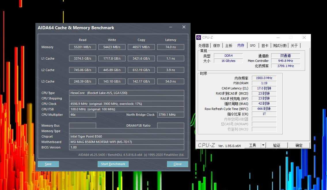 使用的两条3600MHz的内存条,在没有开启xmp状态下只有2400MHz的频率,看样子B560要比Z590原生支持的内存频率低。通过图片就可以看出在2400MHz频率下性能够用吧,当然如果你喜欢内存超频,那么就接着看超频后的表现。