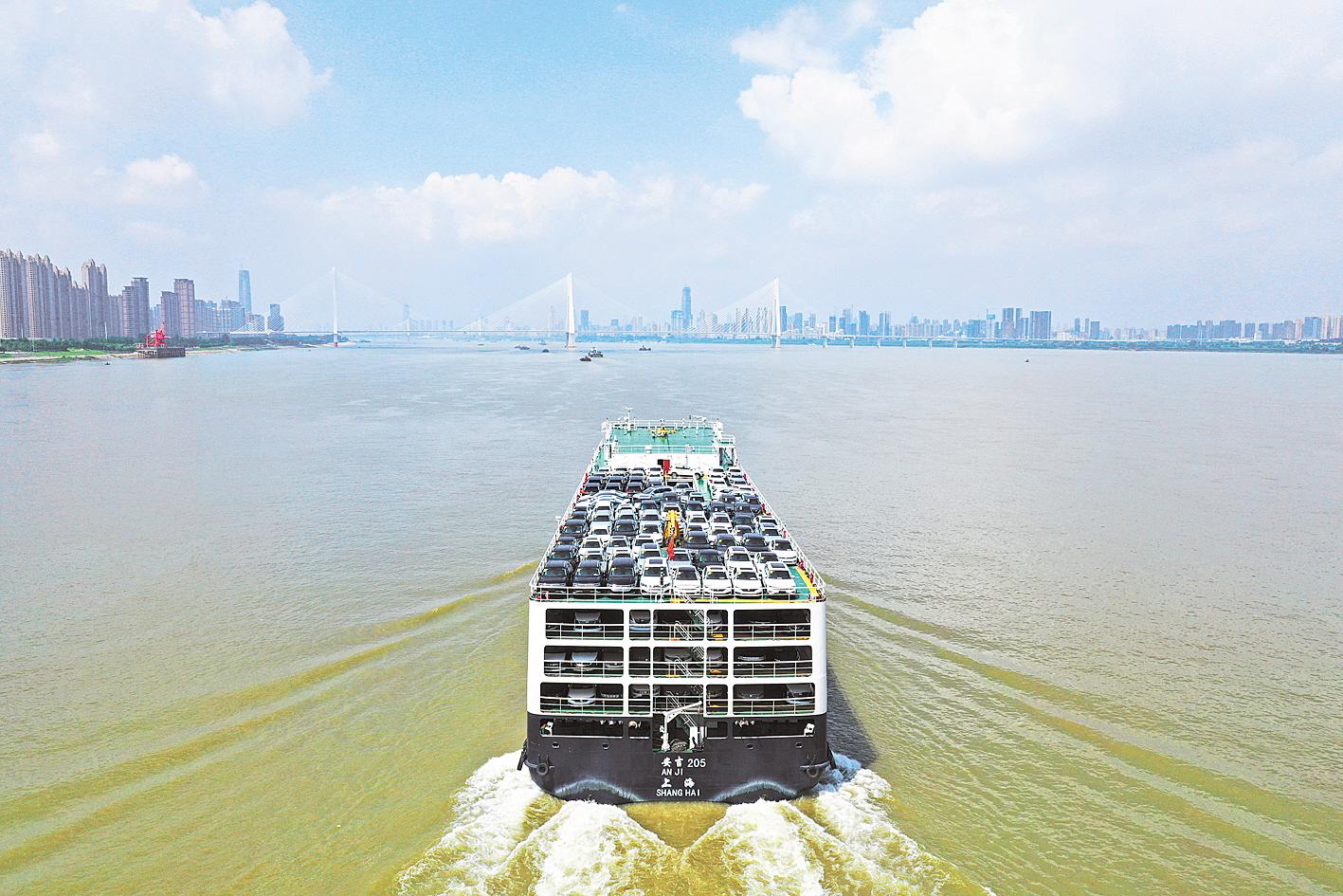 2020年6月4日,长江武汉段水域,一艘满载商品车的滚装船破浪前行。 (湖北日报全媒记者 李溪 摄)