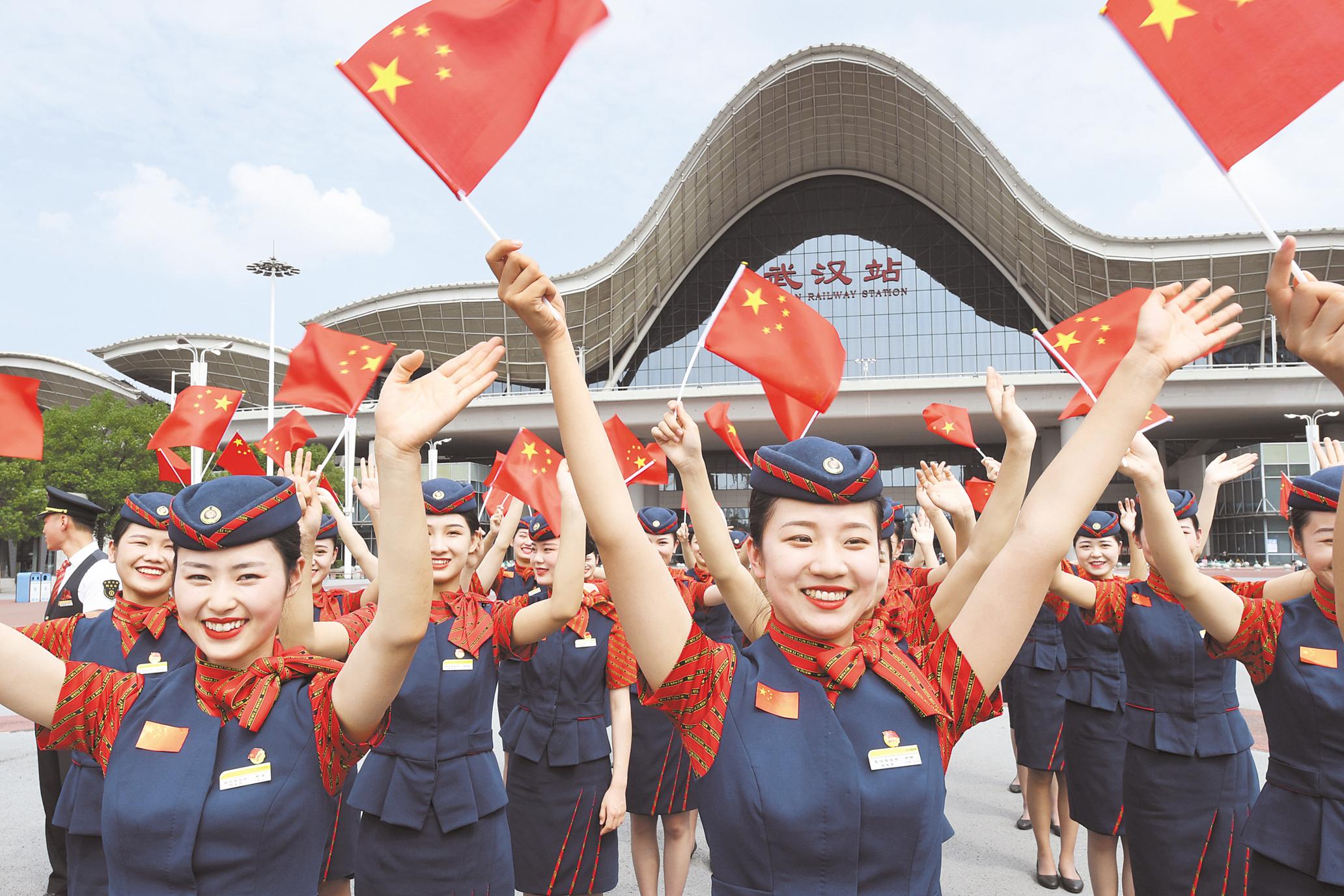 2020年9月28日,武汉铁路部门启动“十一”黄金周客运。当天,百名志愿者在武汉火车站欢迎全国各地旅客“坐高铁游湖北”。 (湖北日报全媒记者 陈勇 摄)