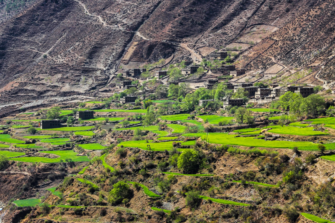 庄房于我来说也是眺望整个俄亚大村的最佳之地。它们同样有三层,底层圈养牲畜,二层为正房,三层晾晒粮食。站在三层视野极其开阔,与对面密密麻麻的蜂巢式村寨形成强烈的对比,远处高山,近处田野,春季麦田在阳光下甚为喜人,炊烟飘荡在庄房顶上,这一刻竟然有了家的感觉。