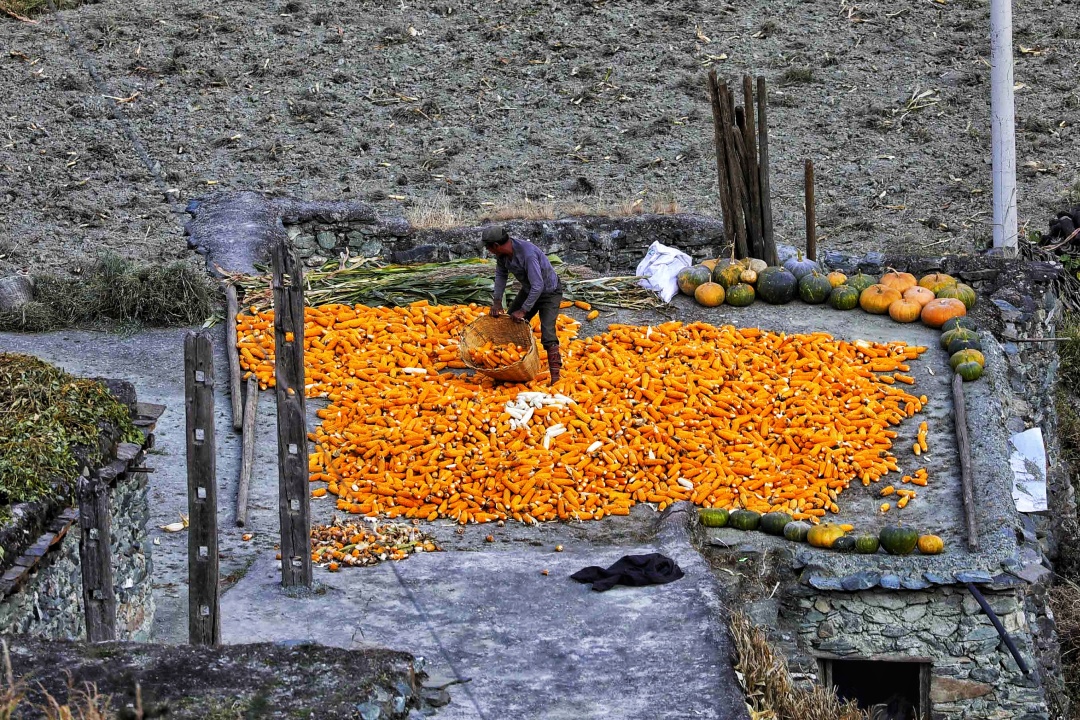 庄房,也是大村特有的一种建筑。因为俄亚的农田都在村子对面的高山上,有的离村子较近,有的则需要步行几小时才能到达,于是家家户户就在自家田边建起了平顶小石碉房子,称之为“庄房”。最开始用于储存劳动工具及劳作时休息,后来慢慢变成了临时住所和粮仓。