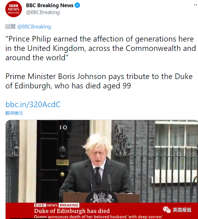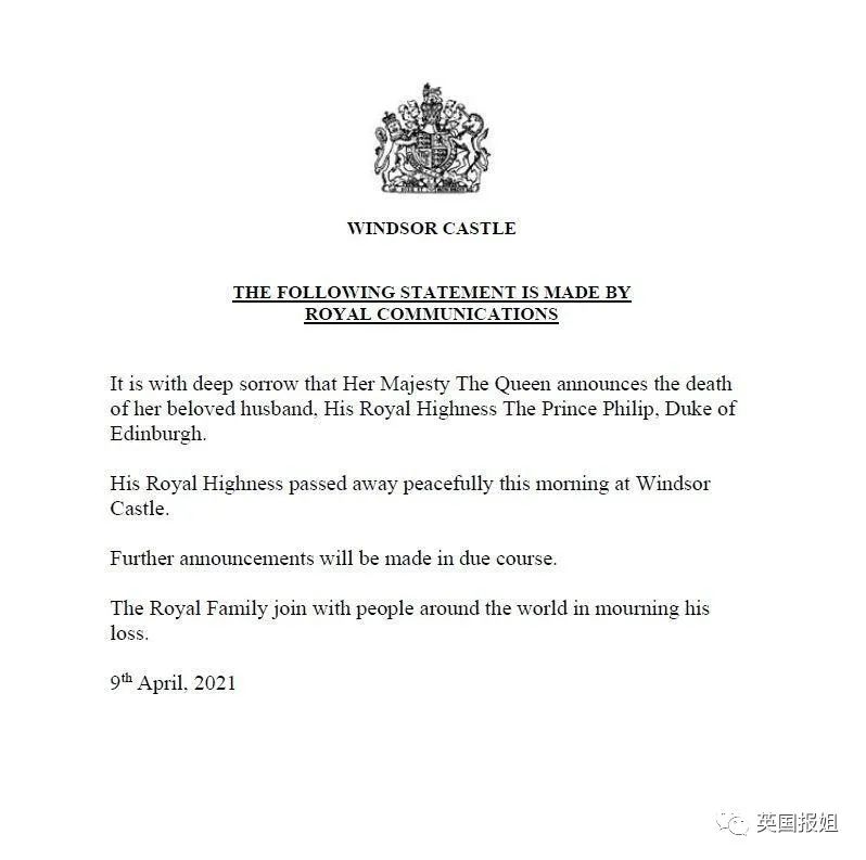 “女王陛下怀着沉痛的心情宣布,她亲爱的丈夫,菲利普亲王殿下,即爱丁堡公爵去世。”