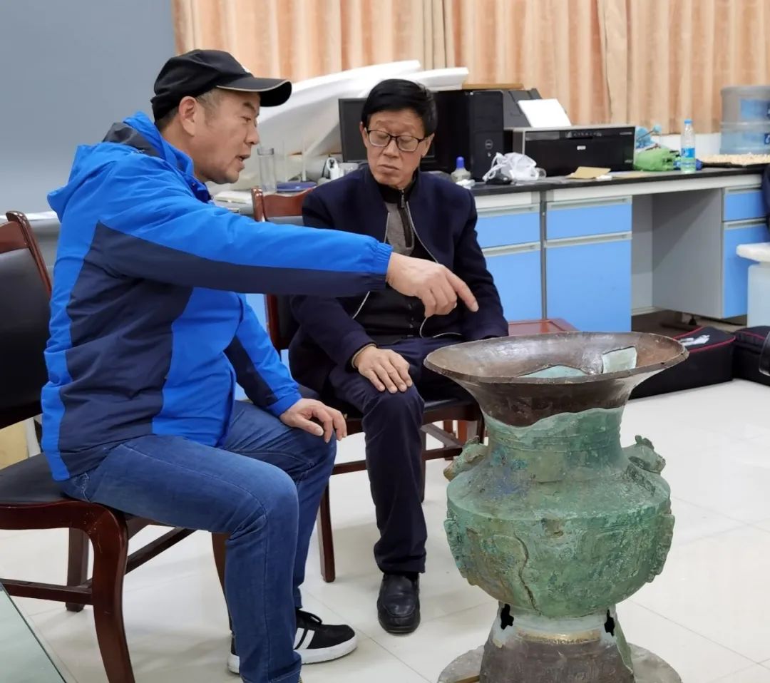 2020年12月,陈德安和郭汉中在讨论修复青铜器,这是二号坑出土最大的铜尊,目前正在修复中。受访者供图