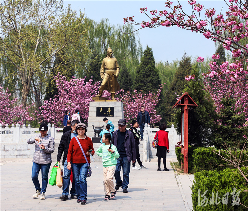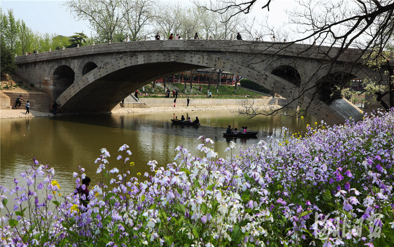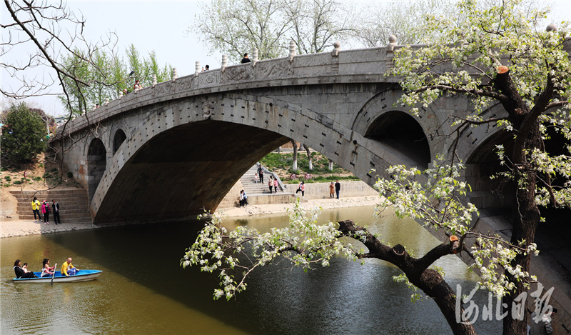 2021年4月10日,游客在石家庄市赵县赵州桥景区踏春赏花。