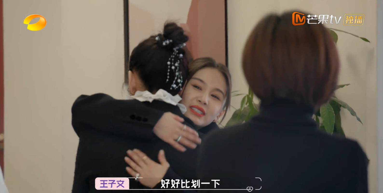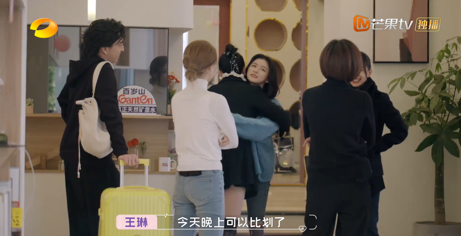 所以第一个出场的是黄奕,她早就收拾好了大包小包的行李。临出门,王子文给她的祝福是:“好好比划一下,”王琳跟上,“今晚就可以比划了。”HOHO~比划是什么梗,大家可以自行百度。