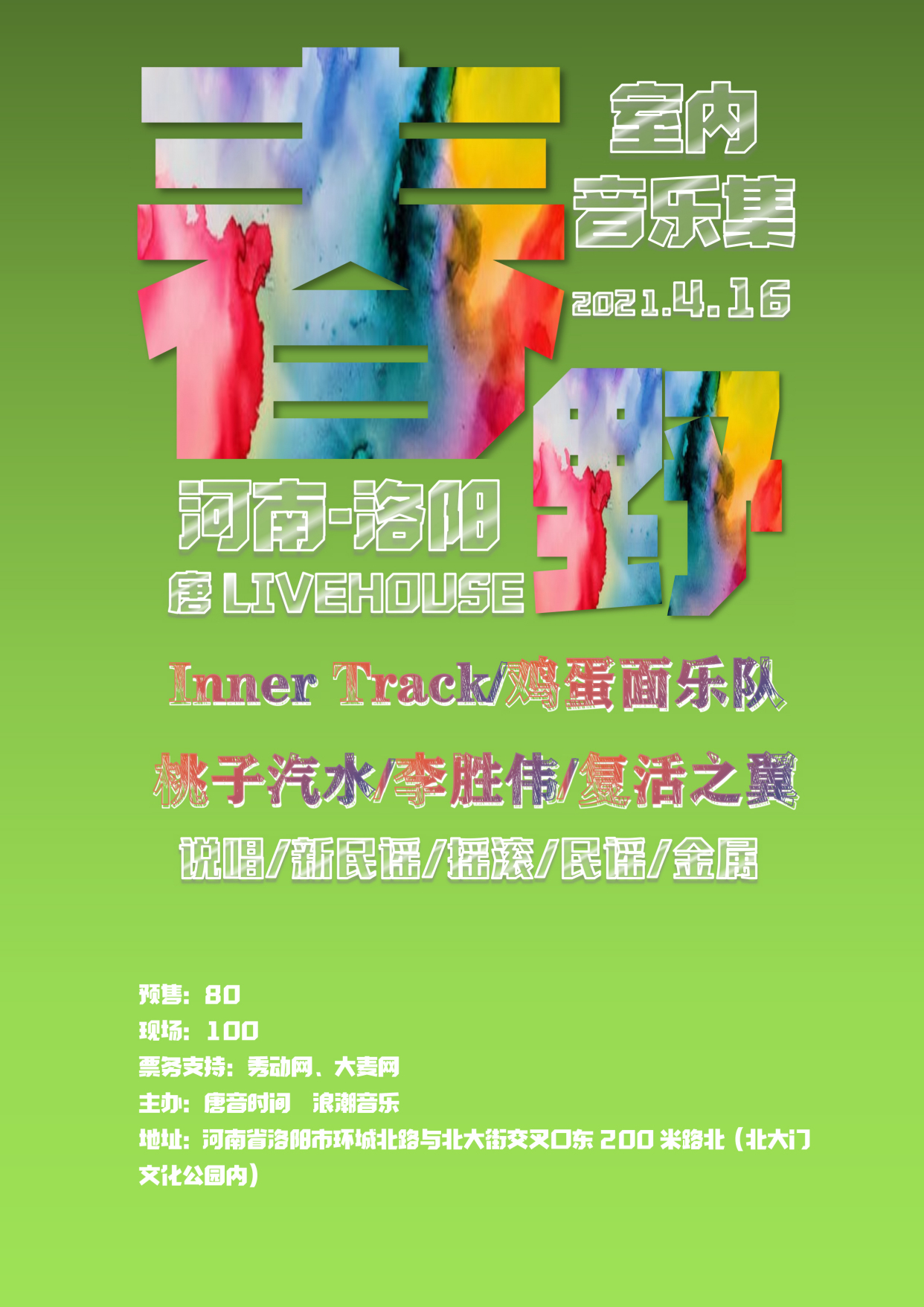春野音乐集演出聚集了民谣、摇滚、说唱、金属等多种不同音乐曲风,鸡蛋面乐队、民谣音乐人李胜伟、洛阳本土摇滚代表桃子汽水乐队、多元化金属曲风复活之翼乐队、说唱歌手Inner Track等五组不同风格的新代表,让你嗨翻这个春天,尽情释放青春的荷尔蒙,现场见吧!