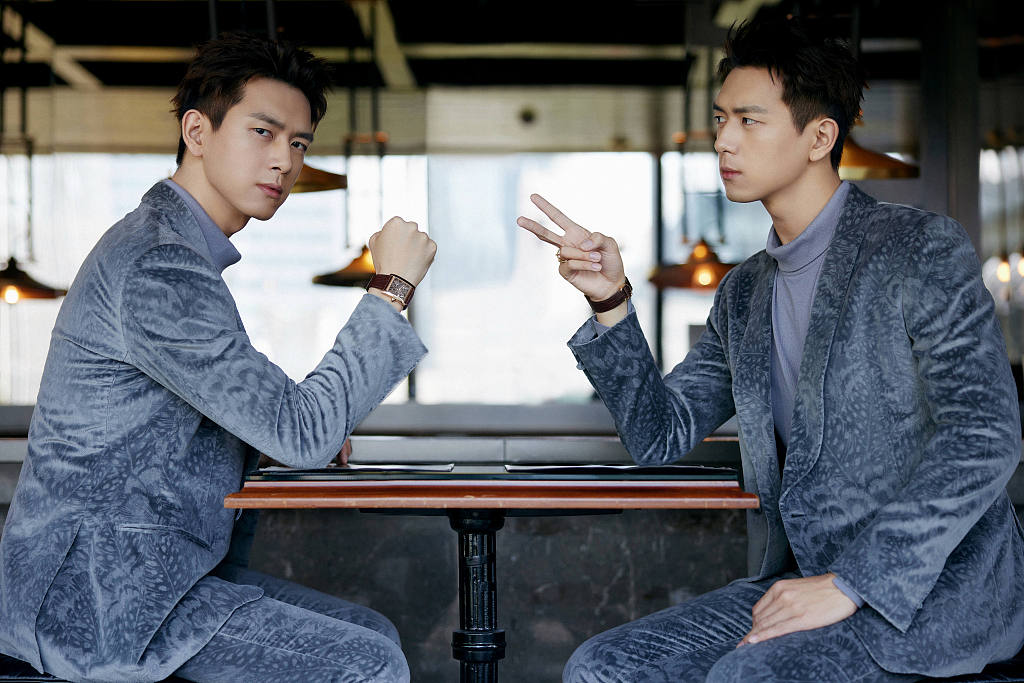 李现优雅丝绒系造型彰显复古格调 与自己面对面猜拳演绎双面魅力