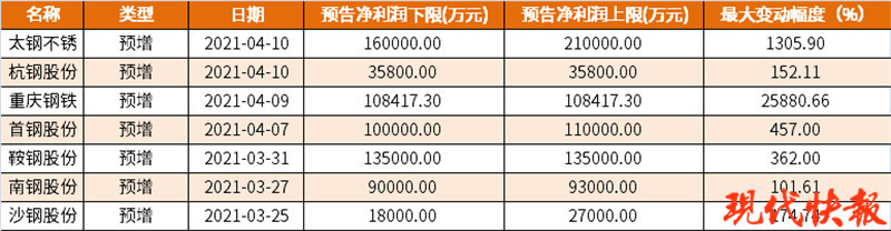 4月9日,重庆钢铁公布一季度业绩预告,预计首季净利润同比增加约10.8亿元,增幅25880.66%。公司表示,自2020年以来,公司实施了一系列技改项目,2021年第一季度,公司抓住钢铁市场复苏的有利时机,产销规模效益稳步提升,生产经营持续向好,实现归属净利润同比大幅增长。去年一季度,公司净利润仅为417万元,在低基数情况下,公司今年业绩暴增,4月9日股价一字涨停。