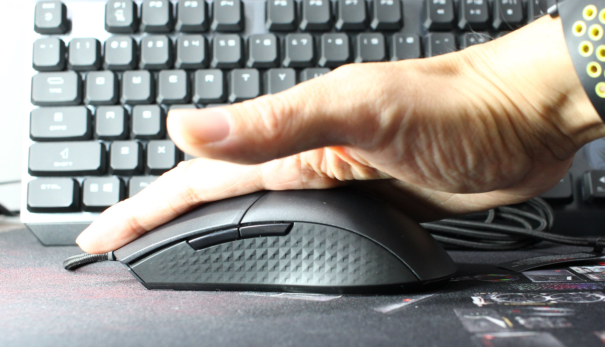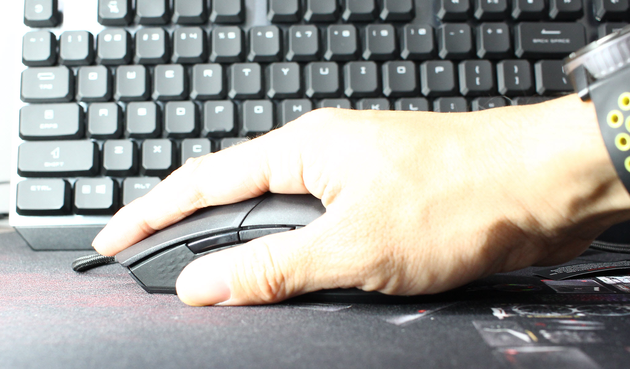GM41采用左右对称设计,滚轮以及鼠标侧面均搭配有防滑菱形纹路。鼠标为标准5按键设计,左右键的面积相当大,滚轮后方则没有常见的DPI切换按钮,不过这种设计能够避免激烈游戏中的误操作,同时减轻鼠标重量。
