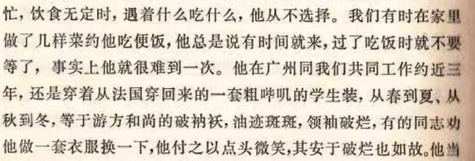 他自己身上常穿的那件衣服,却还是多年前在法勤工俭学时的学生装。