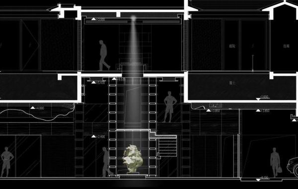 设计剖面图,客厅茶几下方隧道般开口联通地下