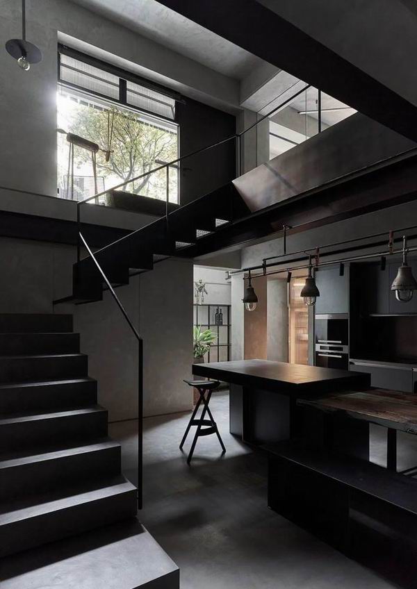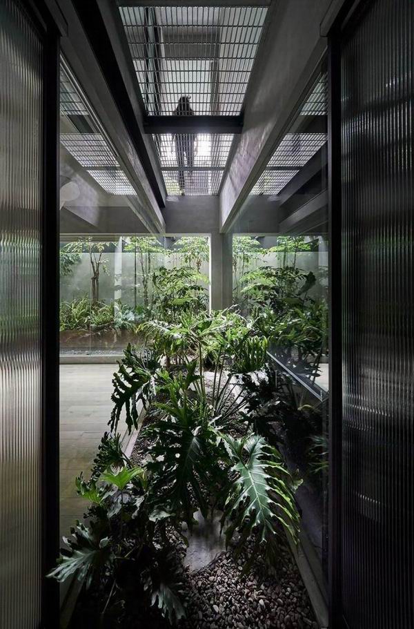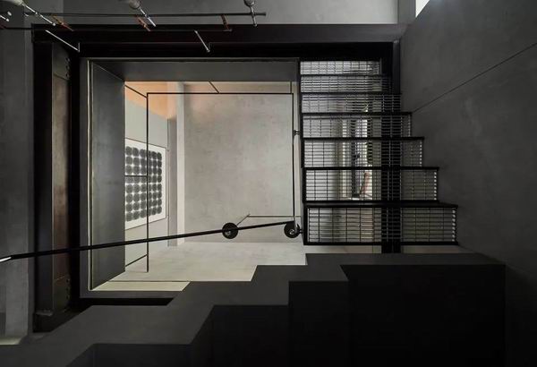 地下室的楼梯采用网格状的金属,增加透光。不同区域的分割,也尽量减少用实体的墙或者门,取而代之的是绿植和玻璃,增加透光性。