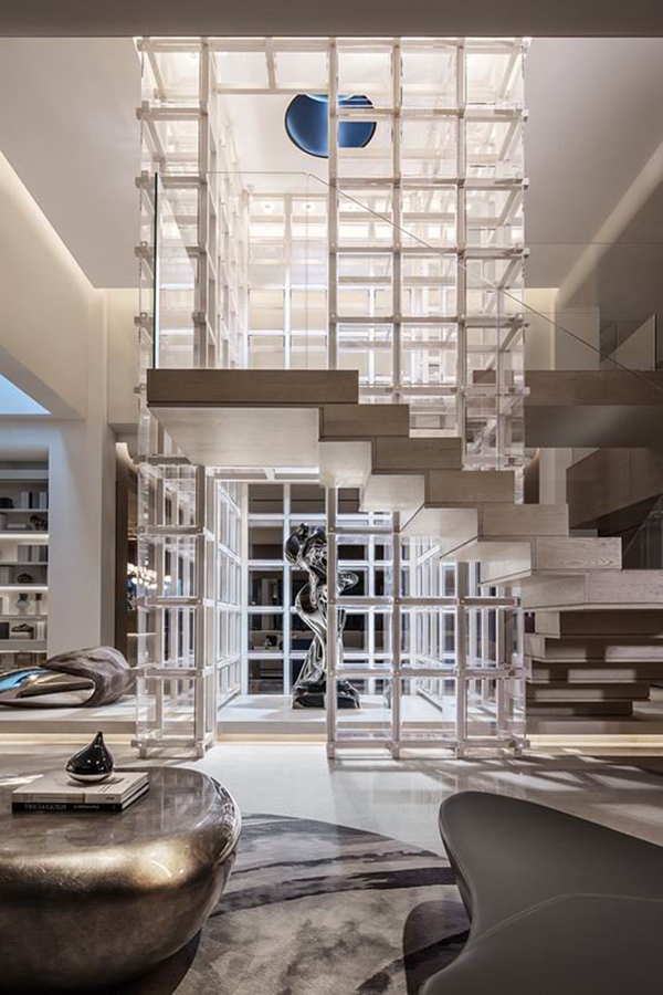 茶几的玻璃是调光玻璃,通电透明,断电雾化。一旦打开开关,光会通过一楼顶部直透地下二层的“内心圣殿”,是整座建筑的“精神意象”:联通着地上与地下,光与黑暗,隐喻着自我与他者,个体与世界等诸种关系的共融。