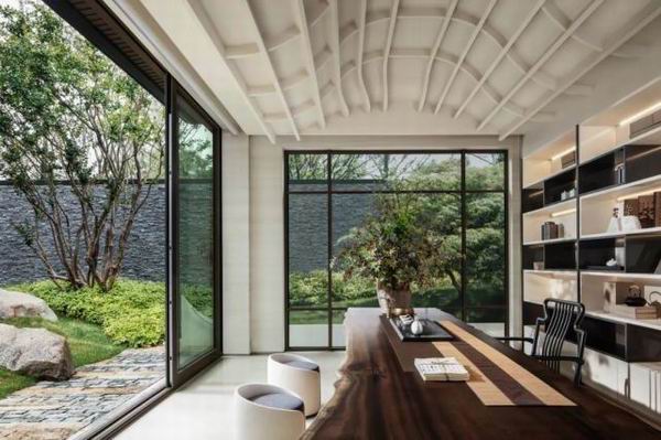 书房傍晚景色,书房灯光流入院中,如水中月推开正门,绕过玄关,映入眼帘的是书房。整面墙的落地窗让院落的景色完全落入眼中,不规则的木板桌面,宛如伏案在林间。书房另一个别致的设计是弓形的房顶,配合波浪状的切线,有些许在游船上的错觉。