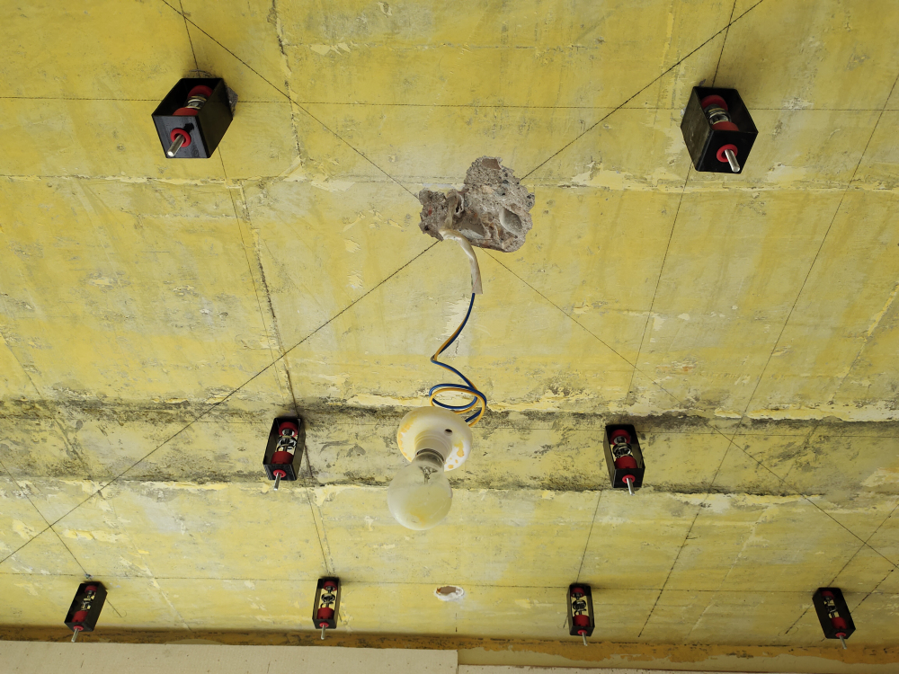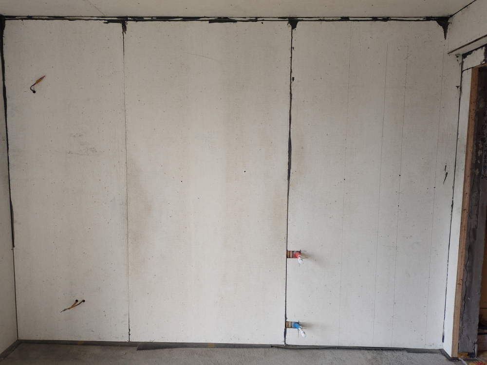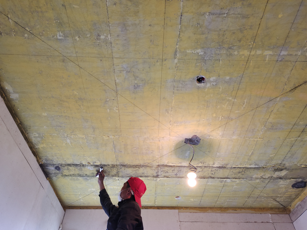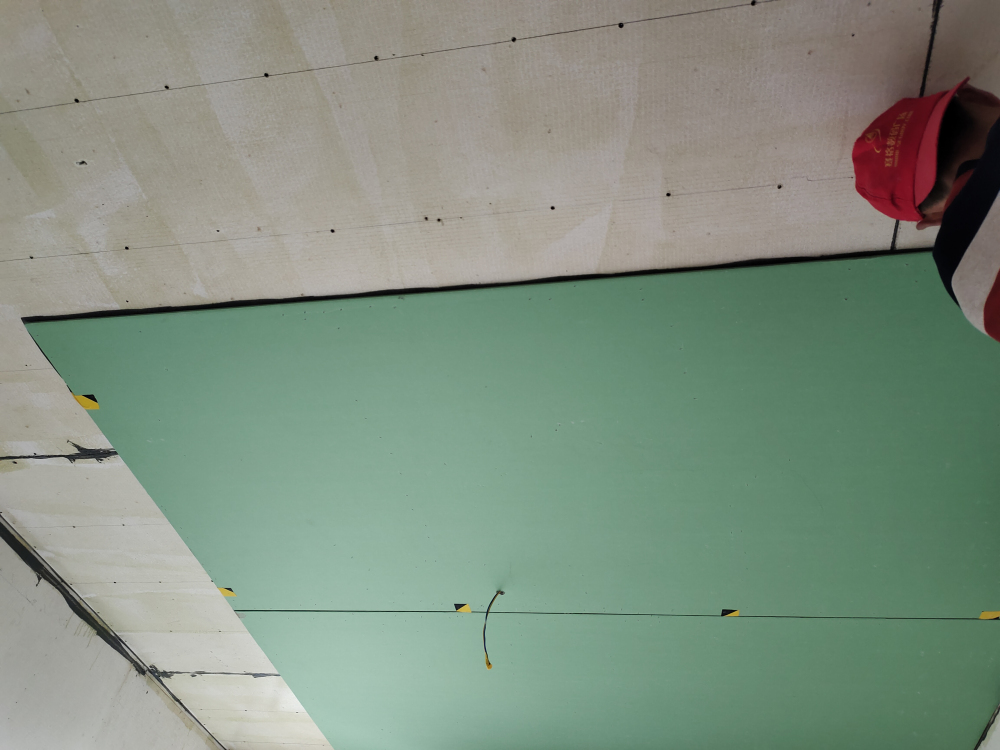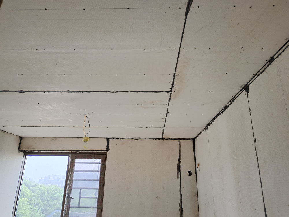 9、隔音板安装,规划好尺寸,尽量减少拼接缝隙。整板上顶特别重,需要两个师傅+支撑才能安装到位,复式等层高超过3米的户型甚至要用升降机支撑。