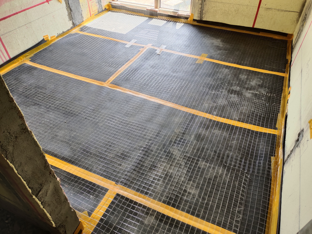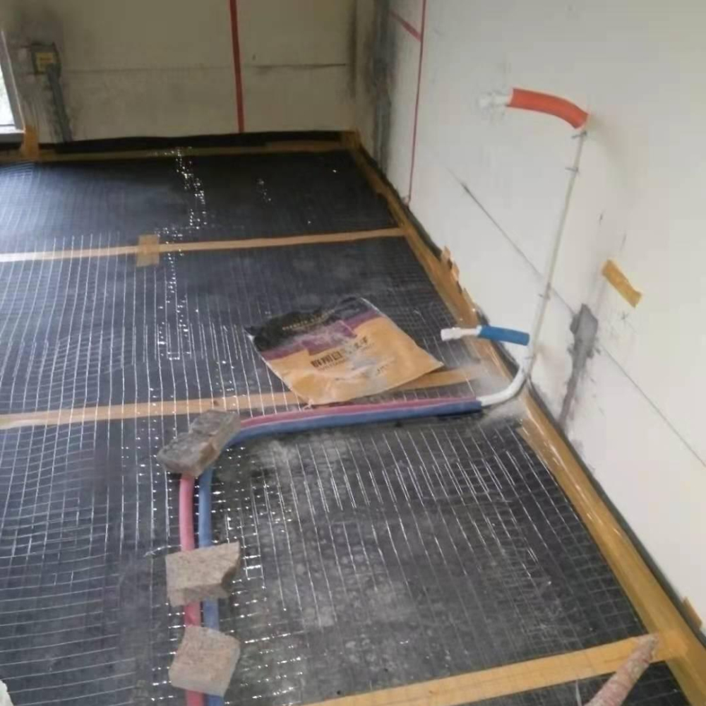 12. 铺设暖气管道,直接压在隔音层上方。顺序不能反,否则暖气管道会要从隔音层穿孔才能上墙,会影响隔音层的密封性。